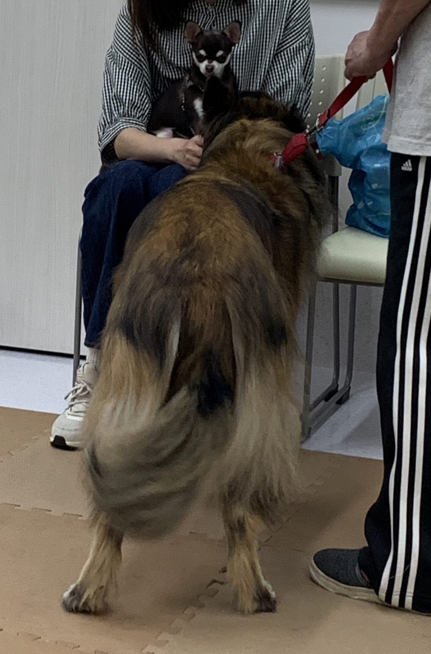ちゃおちゃんは興味はあるようで飼い主さんから離れてましたが、ちょっと怖いようで飼い主さんの方に戻ってました。