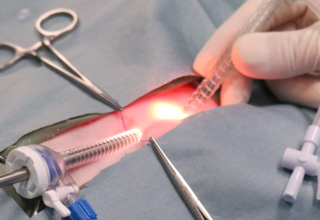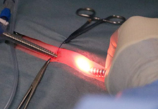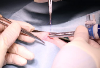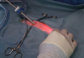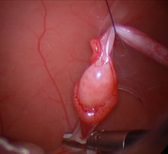 26インチのモニターに拡大された術野を見ながら手術をしているところ