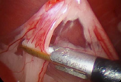 二番目のトロッカーから卵巣子宮をとりだして摘出する