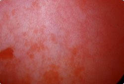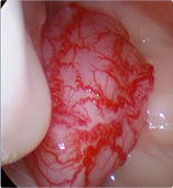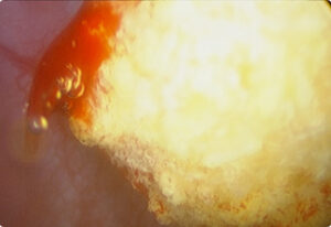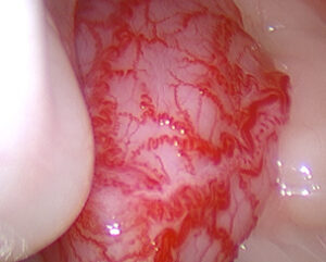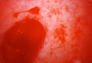 充血した粘膜からの出血によりぼやけてしまっている