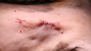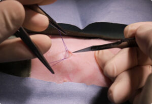 全身麻酔でお腹の毛刈り、消毒をする