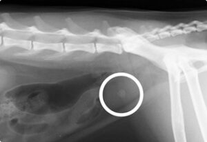 膀胱の出口まで結石が無いことが確認できる 尿道にカテーテルがみえる